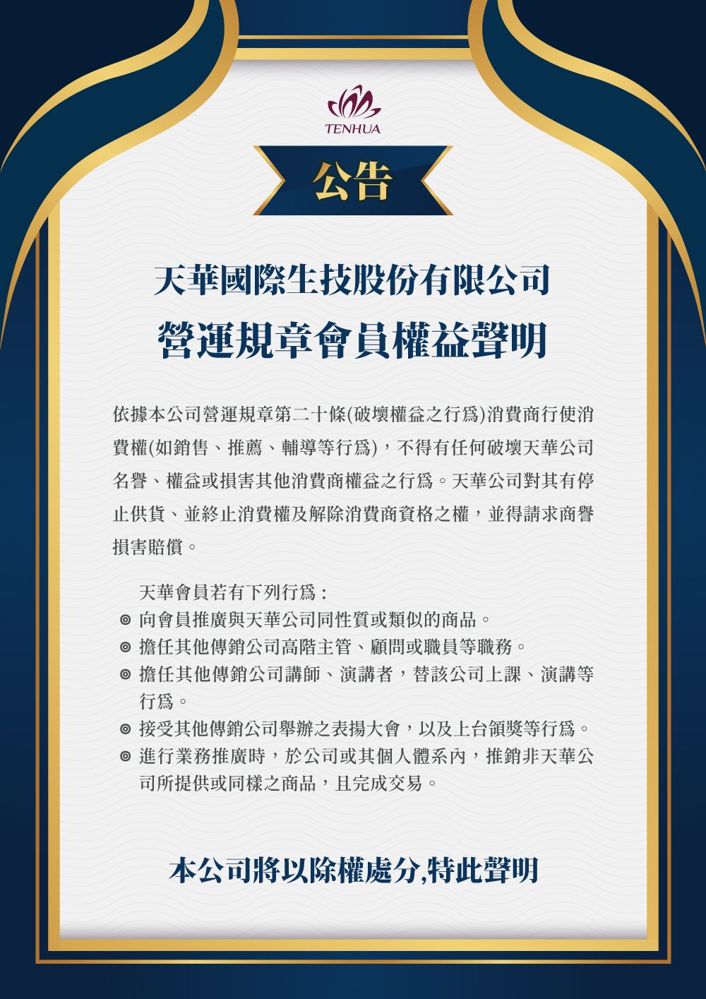 依據本公司營運規章第二十條(破壞權益之行為)消費商行使消費權(如銷售、推薦、輔導等行為),不得有任何破壞天華公司名譽、權或害其他消費商權之行為。